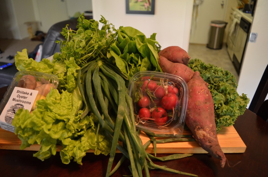 We signed up for a weekly half-share from a company called Relay Foods for the Spring and Summer, and I picked up the first week’s groceries yesterday. There is a pick up station conveniently located a 15-minute walk away. This week our half share consists of a big bunch of curly green kale, two bunches each of bibb and green lettuce, some fresh green pea shoots, three sweet potatoes, beautiful green onions, a small carton of radishes, and an assortment of oyster and shiitake mushrooms. The produce comes from a variety of local farms and will change week to week as new veggies come into season. I had to do a little research to see the best way to store and use the radishes and green pea shoots, but both were very easy to work with!