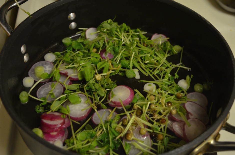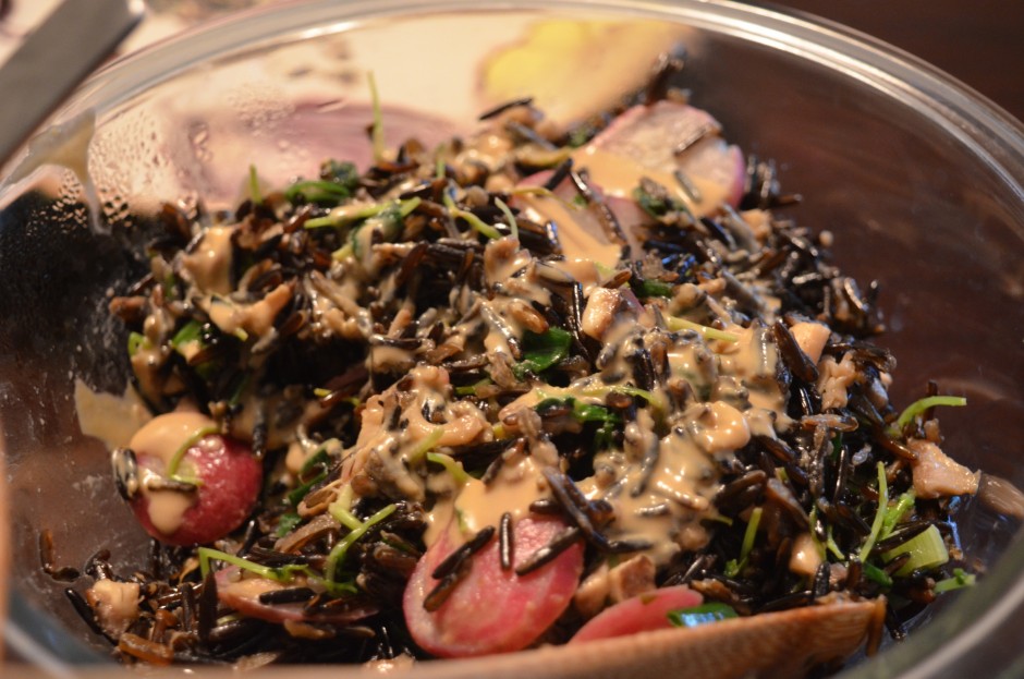 Not wanting anything to go to waste, I cooked up a bunch of the veggies last night. I did a quick stir fry of some thinly sliced radish, green onion, and pea shoots, separately stir fried some mushroom (chopped small so the husband wouldn’t notice!!), and mixed it all together with some nice wild black rice. For taste I added some toasted sesame oil, tahini, and a dash of soy sauce. We had a side salad to go along with it, since we have lettuce for days!!!